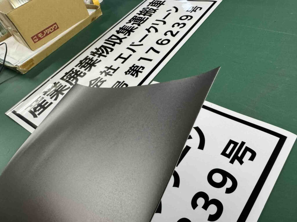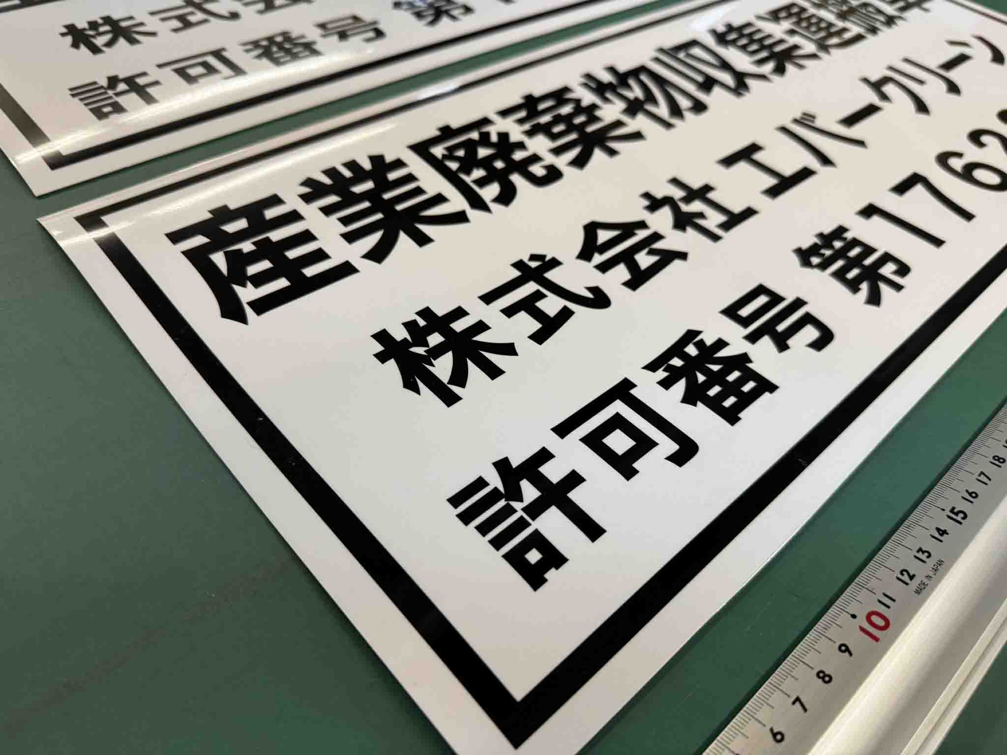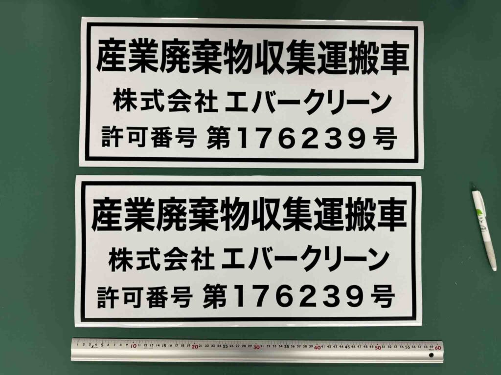 株式会社エバークリーン様より、車両用マグネットシート印刷のご注文をいただきました。産業廃棄物収集運搬車両の許可番号表示用として制作いたしました。強力マグネットシートを使用しており、剥がれに強く耐候性にも優れています。お好みのサイズで作成可能で、デザインもおまかせください。
